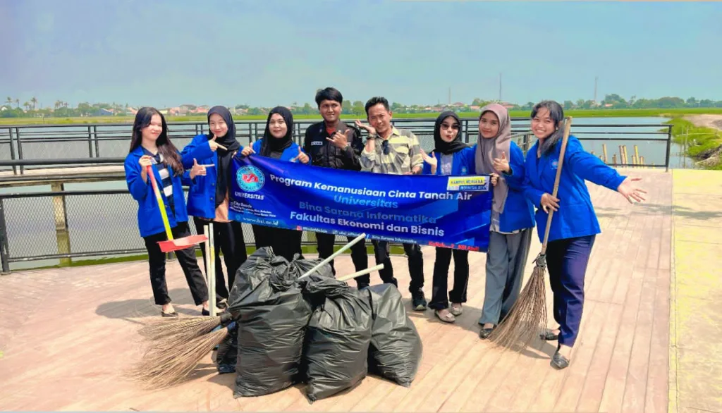BEKASI, GOLANNUSANTARA.COM – Dalam rangka menanamkan nilai-nilai cinta tanah air melalui program kemanusiaan, sekelompok mahasiswa Universitas Bina Sarana Informatika melaksanakan program kemanusiaan bertema “Cinta Tanah Air” dengan kegiatan utama membersihkan sampah di kawasan area wisata Danau Beach City Panjibuwono.