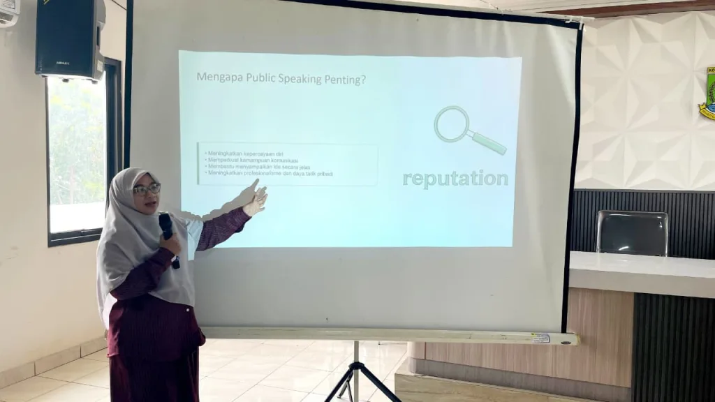 Kegiatan ini menghadirkan narasumber Mike Indarsih, M.I.Kom, dosen komunikasi dari Universitas Bina Sarana Informatika. Dalam pemaparannya, Mike menekankan pentingnya public speaking sebagai keterampilan dasar yang wajib dimiliki oleh setiap aparatur pemerintahan dalam menyampaikan informasi, menjalin koordinasi, dan membangun kepercayaan publik.